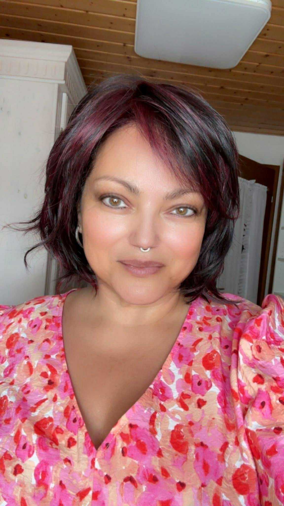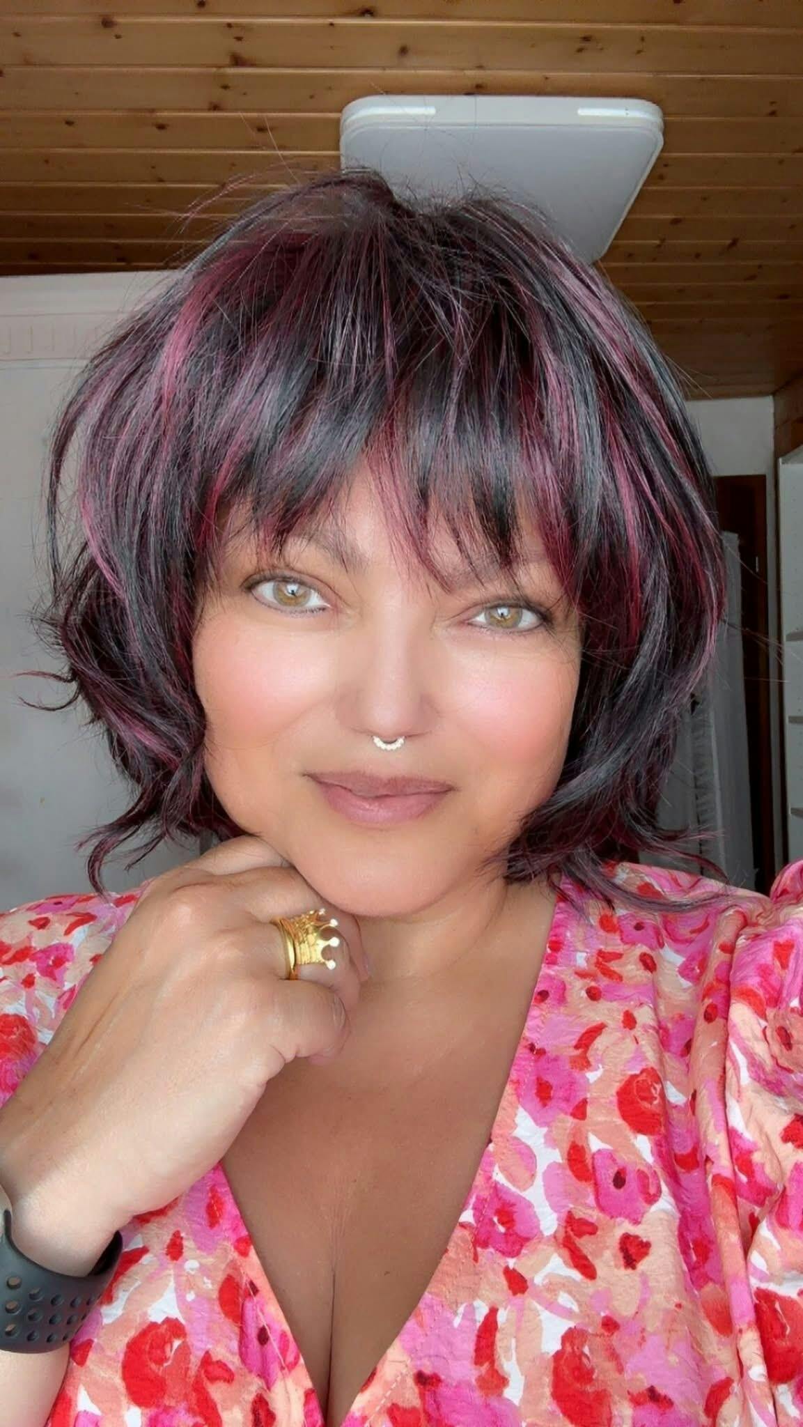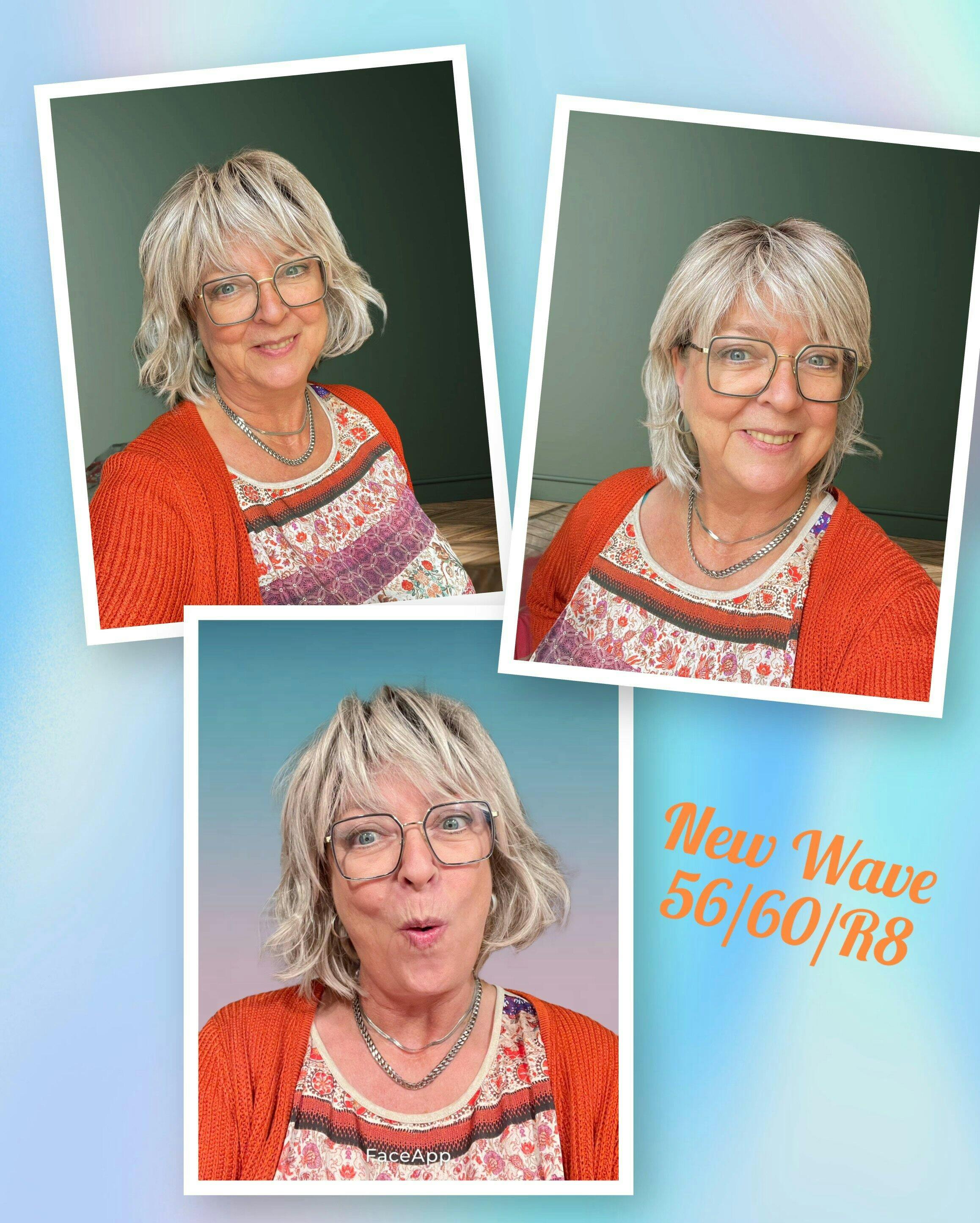 Long mid-length layered bob with feathered bangs, a smooth silky top, textured layers that fall below the collar and a Sheer Comfort cap that is designed with a mesh top and lace front for an undetectable hair line and all day, every-day comfort.